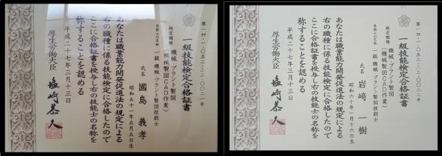弊社より 平成27年度 機械・プラント製図技能検定の一級に二名が挑戦し、合格しました。