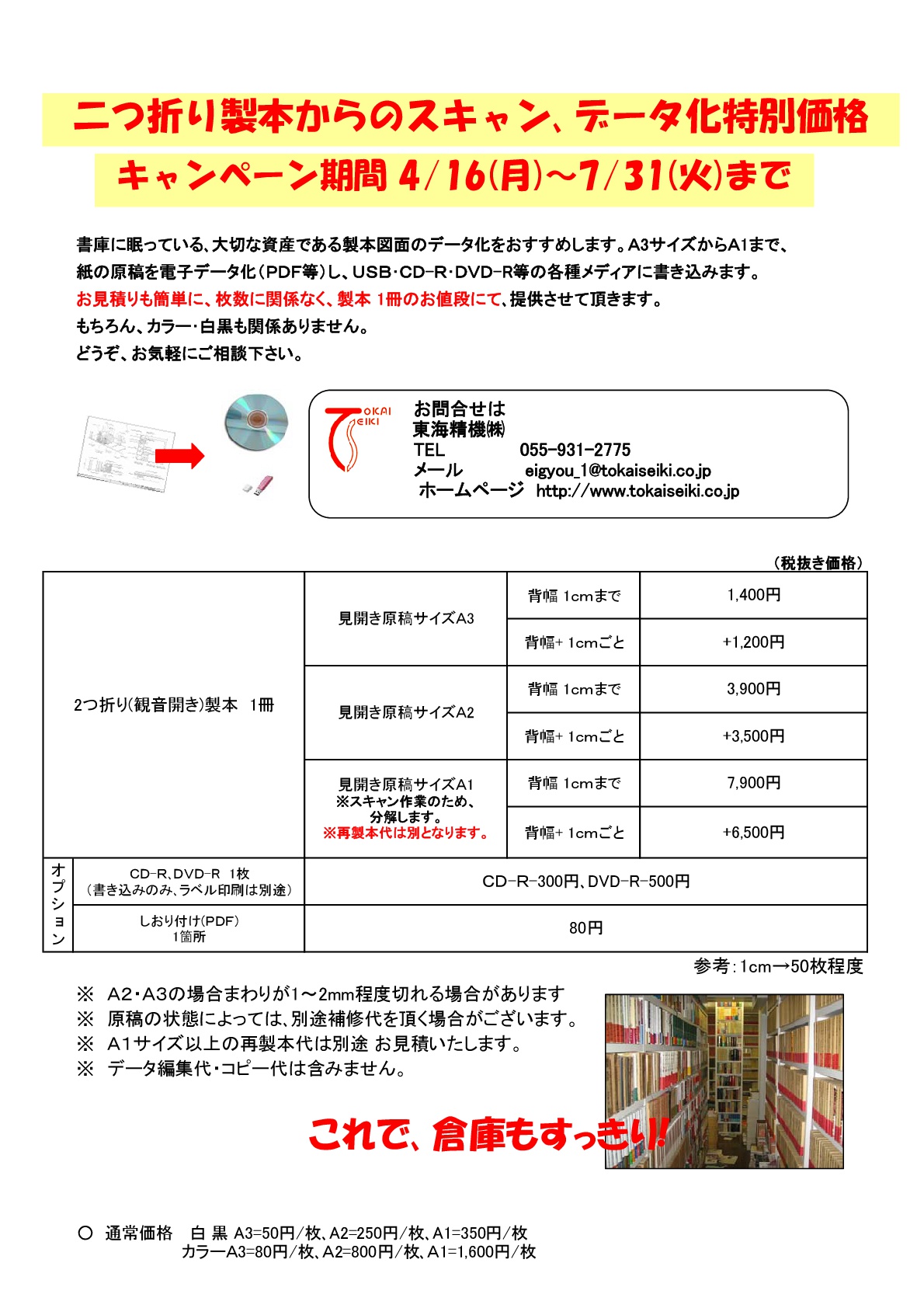 通常は原稿の枚数1枚毎にスキャン代が発生するのですが、こちらのキャンペーンでは、原稿の枚数、色などに関係なく製本の背の厚さで価格を設定しておりますので、枚数が多い場合などにはとてもお得なサービスとなっております。